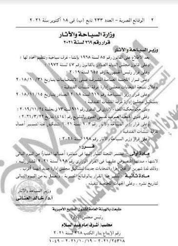 كتبت-مروة السيد : نشرت جريدة الوقائع المصرية في عددها رقم 233 تابع (ب)، الصادر في 18 أكتوبر 2021، قرار وزارة السياحة والآثار رقم 269 لسنة 2021، بشأن استمرار لجنة تسيير أعمال غرفة المنشآت الفندقية لمدة شهرين.