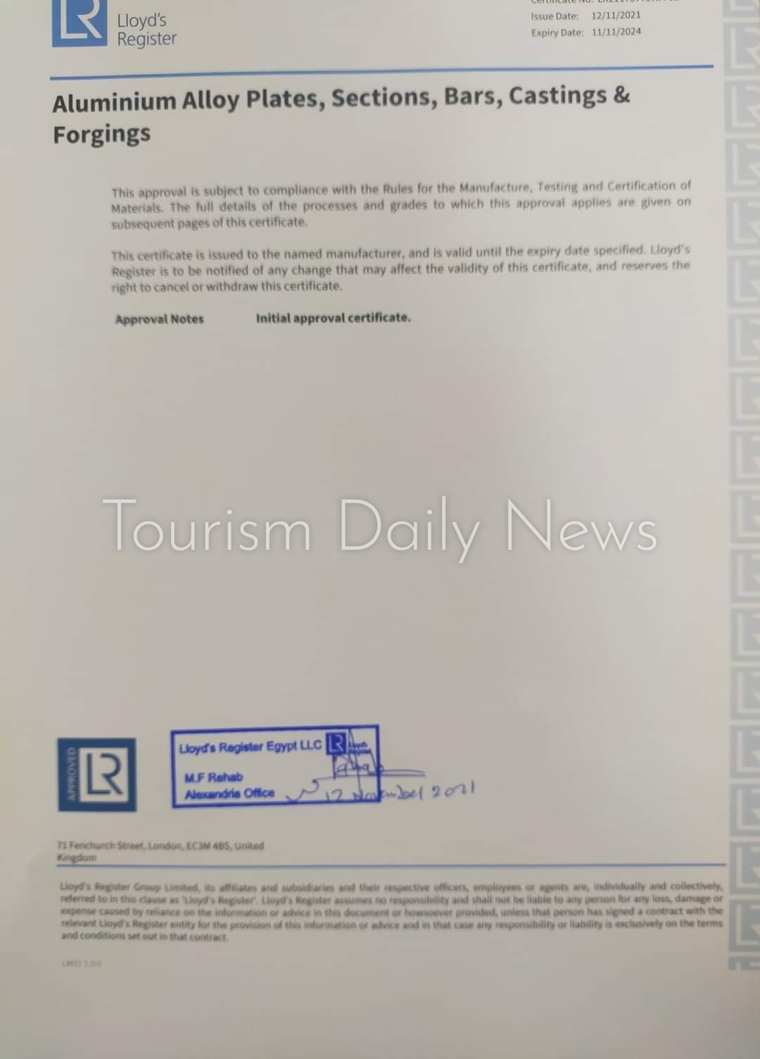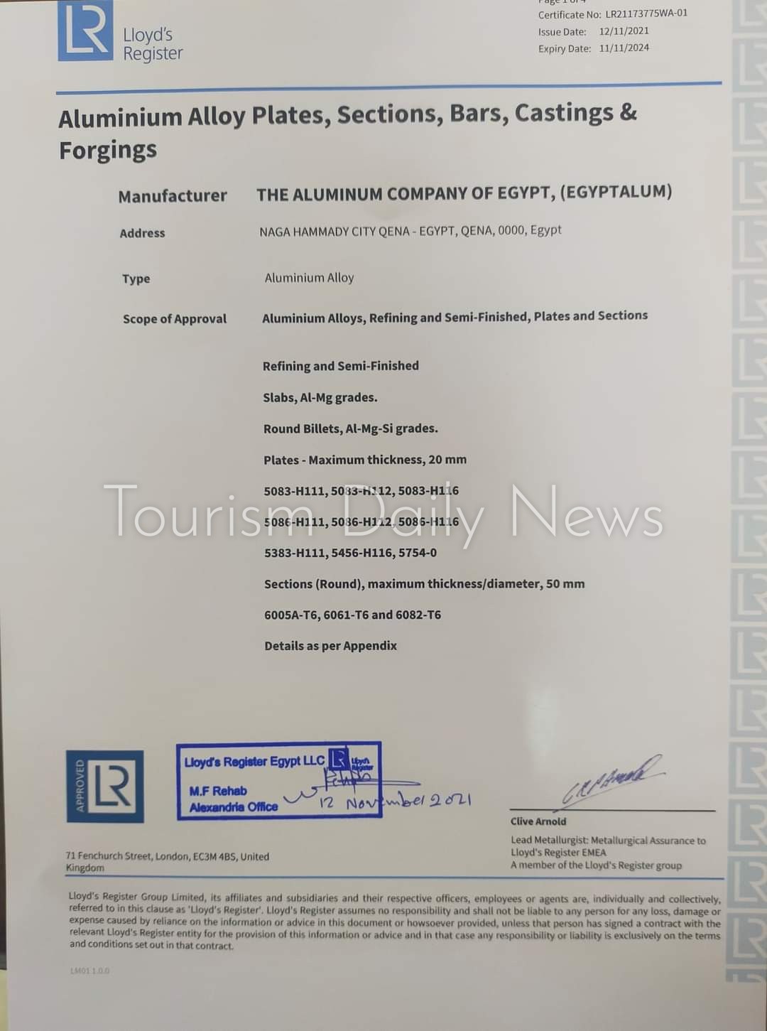 كتب – أحمد زكي : استطاعت شركة مصر للألومينوم الحصول بنجاح على شهادة اعتماد اللويدز ريجيستر الدولية (Lloyd’s Register) الخاصة باعتماد منتجات الشركة من الألومنيوم وسبائكه في الاعمال البحرية Marine Industry.