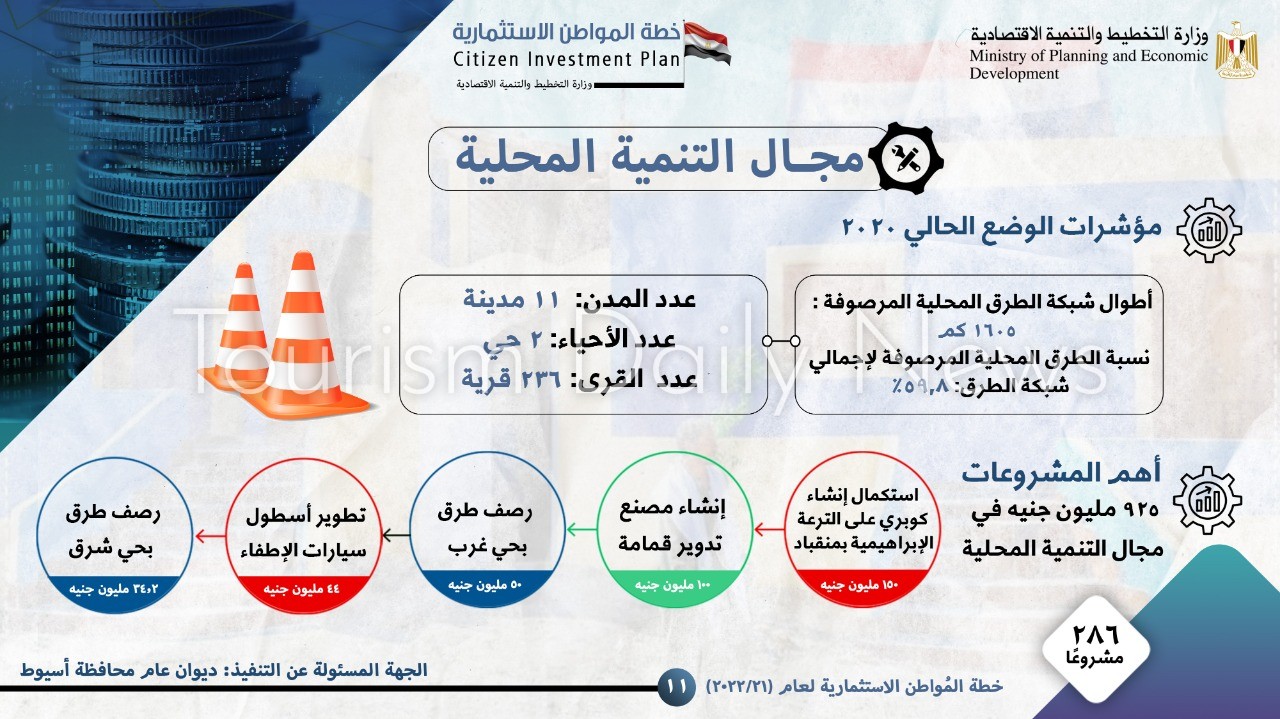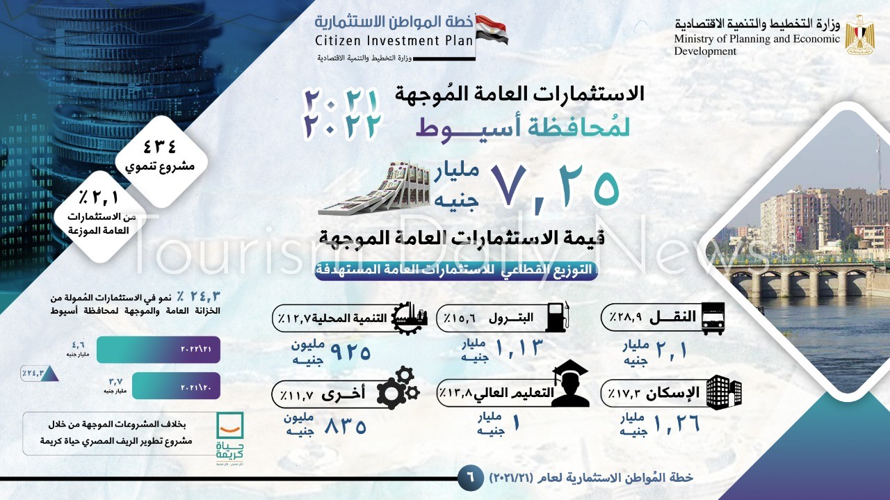 وحول خطة المواطن الاستثمارية بمحافظة أسيوط أوضحت السعيد أن عدد المشروعات التنموية بالمحافظة يصل إلى 434 مشروعًا، وأن قيمة الاستثمارات العامة الموجهة لمحافظة أسيوط بخطة عام 21/2022 تبلغ 7,25 مليار جنيه .