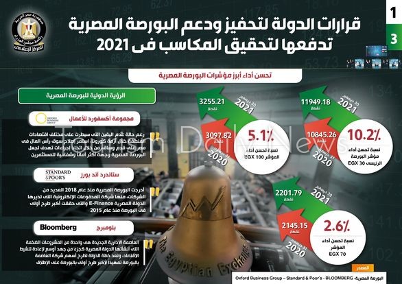 وفي هذا الصدد نشر المركز الإعلامي لمجلس الوزراء تقريراً تضمن إنفو جرافات تسلط الضوء على المكاسب التي حققتها البورصة المصرية في عام 2021 بفضل القرارات التي اتخذتها الدولة لتحفيزها ودعمها.