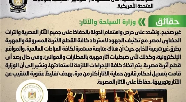 وشددت وزارة السياحة على حرص واهتمام الدولة بالحفاظ على جميع الآثار المصرية والتراث الحضاري لمصر، مع تكثيف الجهود لاسترداد كافة القطع الأثرية المسروقة والمهربة بطرق غير شرعية للخارج، حيث أن هناك متابعة مستمرة لكافة المزادات العالمية، والمواقع الإلكترونية، وكذلك لأي ضبطيات آثار مهربة بالمطارات والموانئ، وفي حال رصد أي قطع أثرية مصرية، يتم اتخاذ كافة الإجراءات اللازمة لاستعادتها.