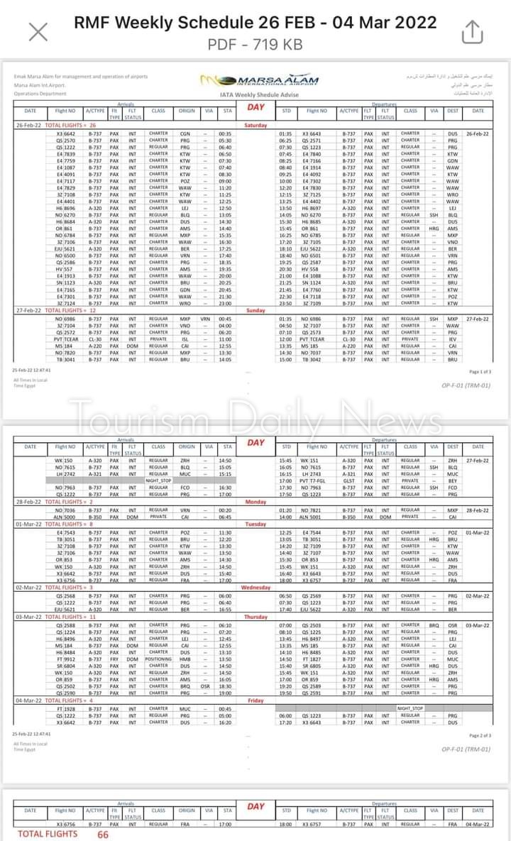 وأوضحت جداول الوصول الأسبوعية لمطار مرسى علم الدولى أن المطار يستقبل، 3 رحلات من بلجيكا، و4 رحلات من هولندا، و8 رحلات من إيطاليا، و14 رحلة من ألمانيا، و12 رحلة من التشيك، و16 رحلة من بولندا، و3 رحلات من سويسرا، ورحلة من لتوانيا، فضلاً عن 3 رحلات داخلية على متن مصر للطيران ليصل عدد الرحلات إلى 51 رحلة.