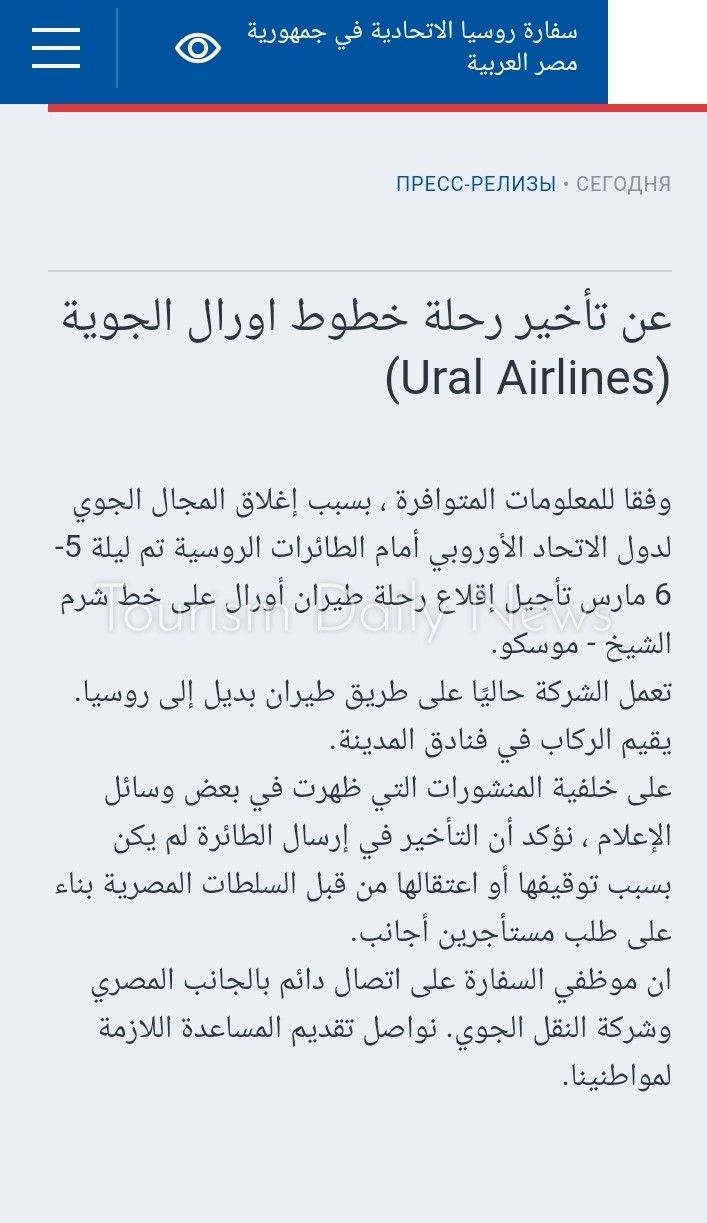 وقالت السفارة الروسية، في بيان: “وفقًا للمعلومات المتوافرة، فبسبب إغلاق المجال الجوي لدول الاتحاد الأوروبي أمام الطائرات الروسية منذ ليلة 5 و6 مارس، تم تأجيل إقلاع رحلة طيران أورال على خط شرم الشيخ- موسكو”.
