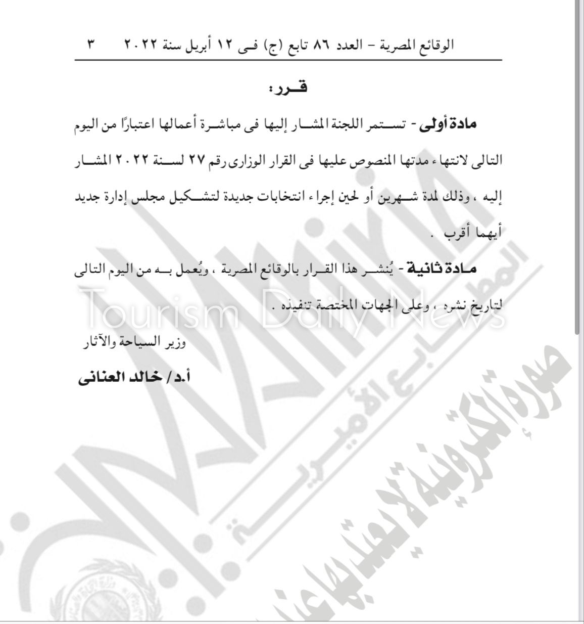 كما جاء القرار بعد الإطلاع على قرار وزير السياحة رقم 611 لسنة 2018، وحكم محكمة القضاء الإداري في الدعوى رقم 911 لسنة 73 ق، وفتوى الجمعية العمومية لقسمي الفتوى والتشريع رقم 414 لسنة 2021، وقرار وزير السياحة والآثار رقم 103 لسنة 2021 بتشكيل لجنة لتسيير أعمال غرفة المنشآت الفندقية.