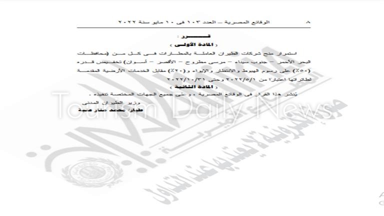 وأوضح نص القرار، الذي نشرته الجريدة الرسمية، أنه يستمر العمل بقرار منح شركات الطيران، العاملة بالمطارات المصرية في كل من محافظات (البحر الأحمر وجنوب سيناء ومرسى مطروح والأقصر وأسوان) وجميعها مطارات سياحية، تخفيضا قدره 50% على رسوم الهبوط والإيواء والانتظار.