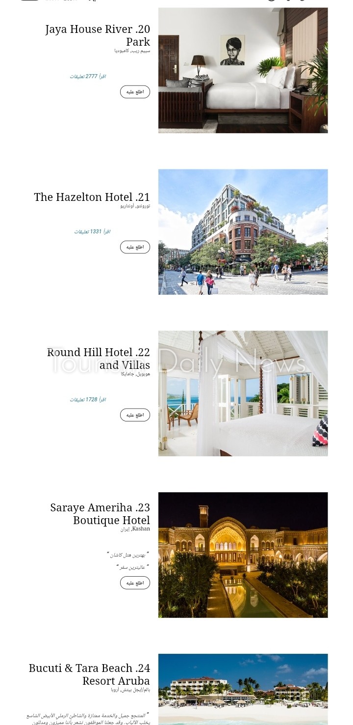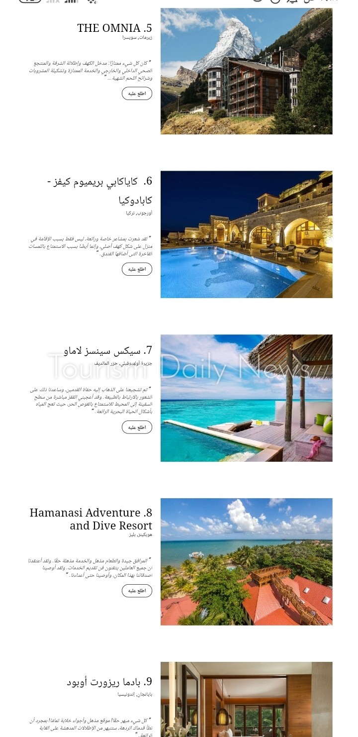 وجاء فندق كاياكابي بريميوم كيفز – كابادوكيا فى المرتبة السادسة، وفندق سيكس سينسز لاماو بجزر المالديف فى المرتبة السابعة، وفندق Hamanasi Adventure and Dive Resort هوبكينز، بليز فى المرتبة الثامنة.