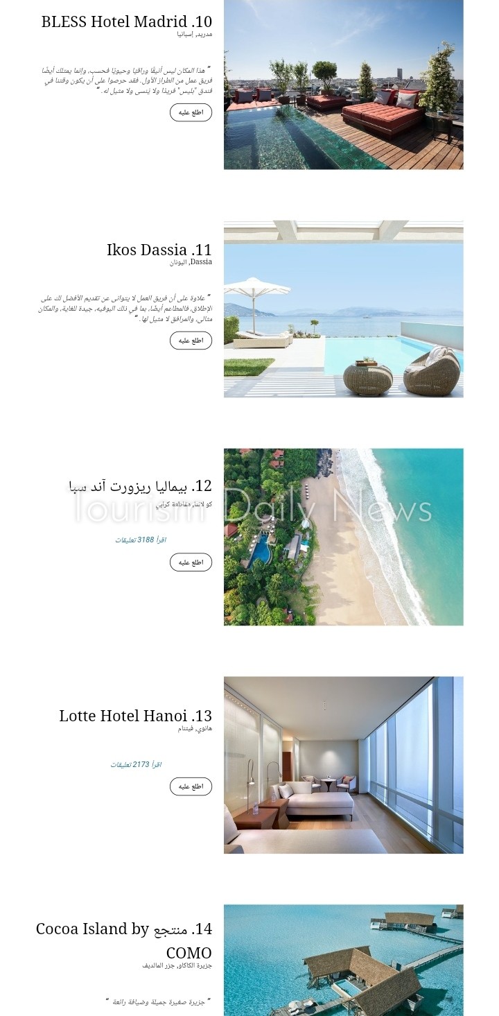 وجاء فندق بادما ريزورت أوبود بإندونيسيا فى المرتبة التاسعة، وفندق BLESS Hotel Madrid بإسبانيا فى المرتبة العاشرة.