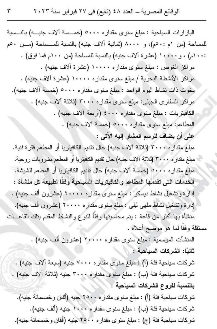 5- فرض رسم سنوي يتراوح بين 3 و7 آلاف جنيه على الشركات السياحية، وفقا لفئة كل شركة.