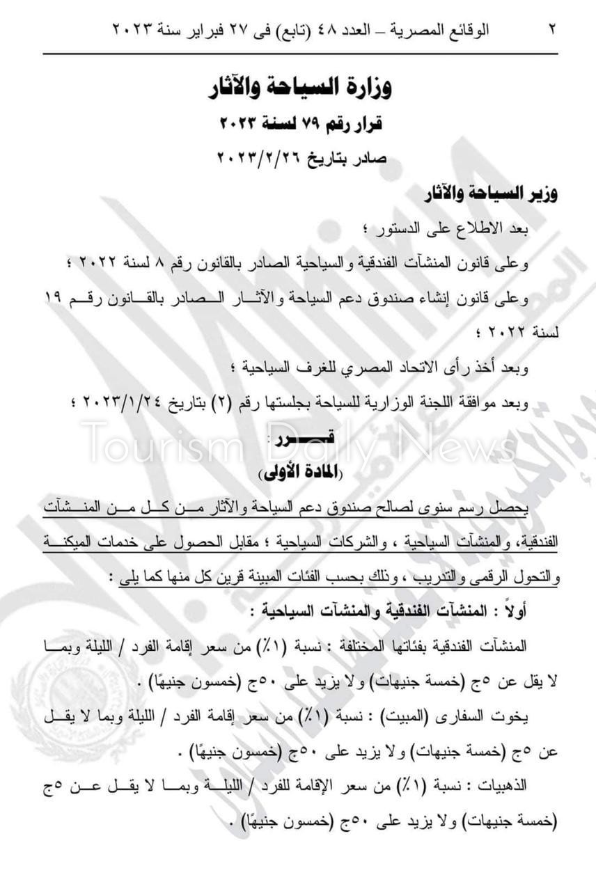 1- إضافة رسم بقيمة 1% من سعر إقامة الفرد أو الليلة الفندقية على الفنادق، بما لا يقل عن 5 جنيهات، ولا يزيد عن 50 جنيها”، كما تطبق نفس النسبة على يخوت السفاري.