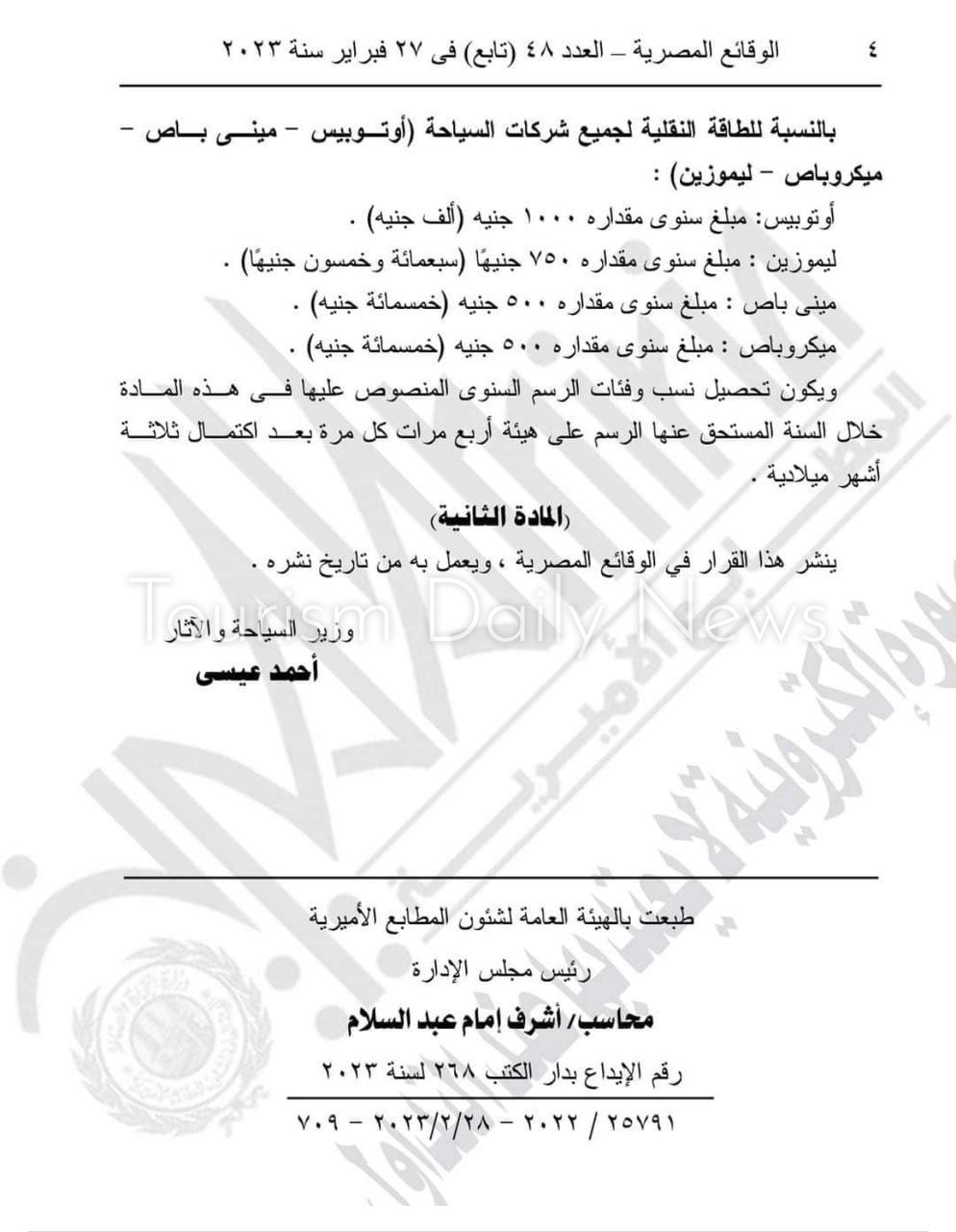وجاءت تفاصيل القرار الذي نشرته الجريدة الرسمية، الأربعاء أول مارس ، بعد أخذ رأي الاتحاد المصري للغرف السياحية، على النحو التالي: