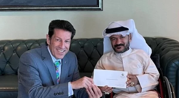 وقد استلم التبرع جميل سبت رئيس الشؤون المالية مقدماً من جارفيلد جونز – الرئيس التنفيذي لمجموعة فنادق الخليج.