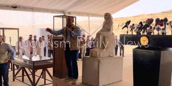 واستهل وزير السياحة والآثار المؤتمر الصحفي بإلقاء كلمة رحب خلالها بالحضور معرباً عن سعادته بتواجده في منطقة آثار سقارة التي تعتبر أحد أهم أجزاء جبانة منف المُسجلة على قائمة التراث العالمي لليونسكو والتي هي أيضا بمثابة متحفاً مفتوحاً يُبرز جانباً كبيراً من فترات التاريخ المصري القديم حيث تَحتضن أقدم بناء حجري في تاريخ البشرية وهو هرم زوسر المدرج بالإضافة إلى العديد من أهرامات الملوك والملكات.