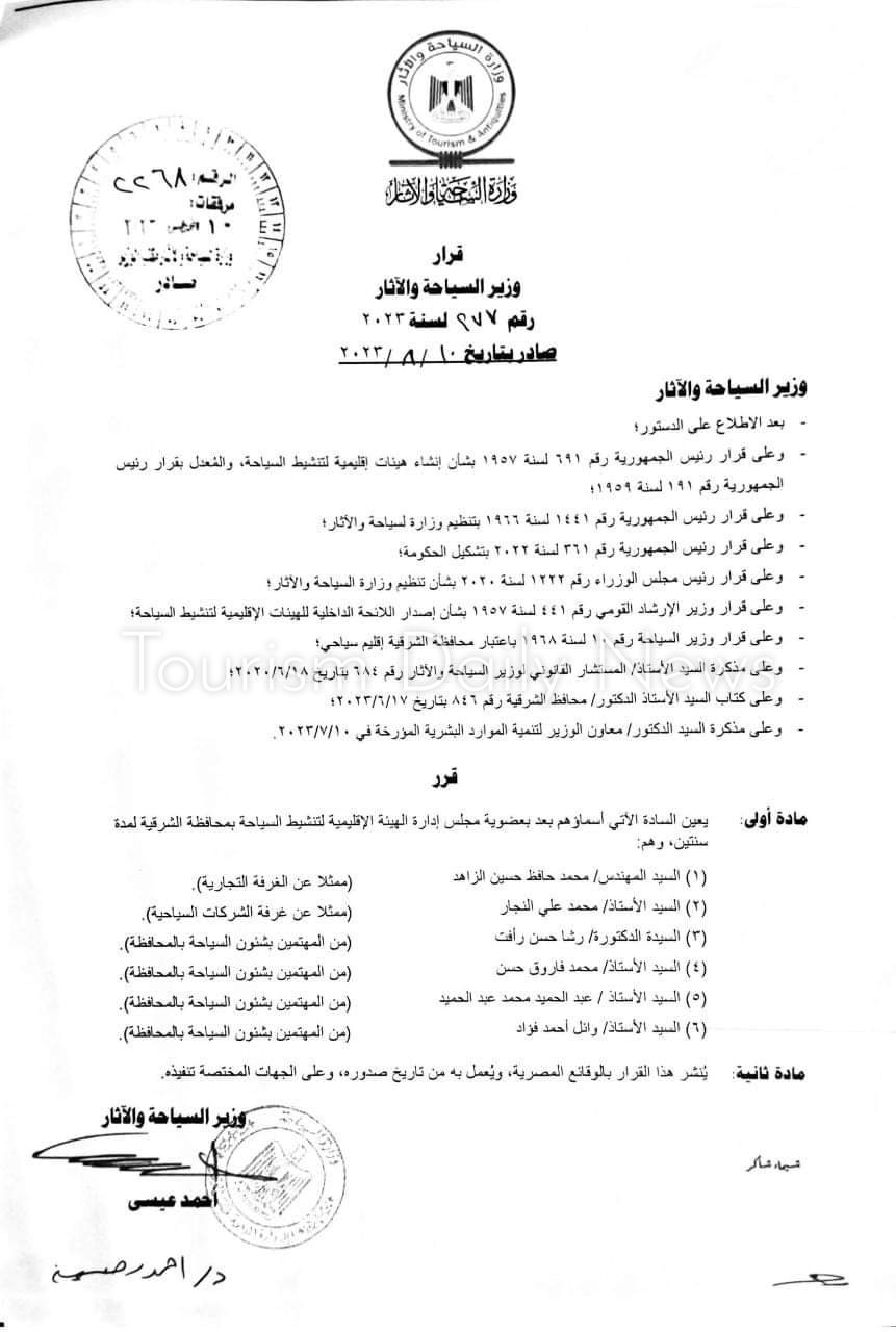 كتبت – دعاء سمير : أصدر احمد عيسى وزير السياحة والآثار قرارا بتشكيل هيئة تنشيط السياحة بالشرقية .