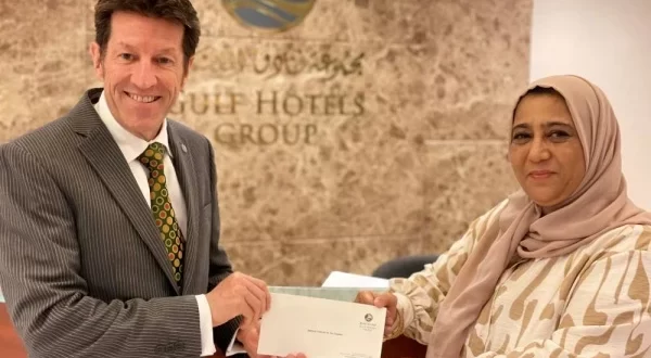 وقد إستلمت التبرع السيدة غيداء النعيمي – مديرة المؤسسة – مقدماً من السيد جارفيلد جونز – الرئيس التنفيذي لمجموعة فنادق الخليج.