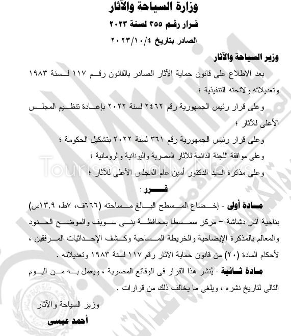 بعد الاطلاع على قانون حماية الآثار الصادر بالقانون رقم 117 لسنة 1983 وتعديلاته ولائحته التنفيذية ؛ وعلى قرار رئيس الجمهورية رقم 2462 لسنة 2022 بإعادة تنظيم المجلس الأعلى للآثار؛ وعلى قرار رئيس الجمهورية رقم 361 لسنة 2022 بتشكيل الحكومة؛ وعلى موافقة اللجنة الدائمة للآثار المصرية واليونانية والرومانية.
