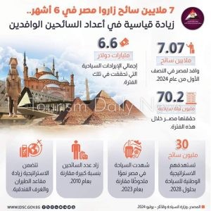 كتبت- سها ممدوح: استقطبت مصر نحو 7 ملايين سائح خلال النصف الأول من العام الجاري، وقفزت الإيرادات السياحية إلى 6.6 مليار دولار.