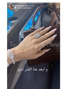 وكانت جورجينا قد تقاسمت صورة ليدها وهي ترتدي خاتما وساعة ماسية وتمسك بحقيبة هيرمس، مظهرة وشما عربيا، أعادت كتابة ما جاء فيه عبر تعليق أرفقته للصورة، ليتبن أنه دعاء كتب فيه “وأبعد عنا الشر آمين”.