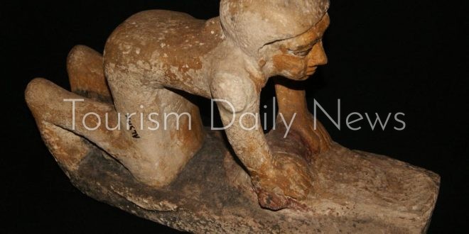 يعرض تمثال لخادمة من الحجر الجيرى تقوم بطحن الحبوب على قاعده مستطيلة
