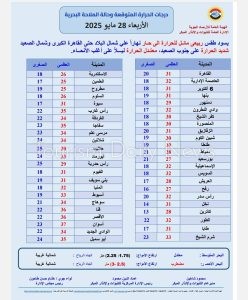 وفيما يلي بيان بدرجات الحرارة المتوقعة اليوم على محافظات ومدن مصر:-
