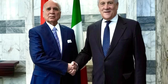 وذكر بيان للوزارة تلقته (اليوم الاخبارية ) أن “وزير الخارجية التقى نظيره نائب رئيس مجلس الوزراء ووزير الخارجية الإيطالي، أنطونيو تاياني، وذلك في إطار زيارته الرسمية إلى روما، حيث جرى بحث العلاقات الثنائية بين البلدين وتطورات الأوضاع الإقليمية”.