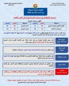 وكالات : أكدت الهيئة العامة للارصاد الجوية أن أخر صور الأقمار الصناعية تشير الى تدفق السحب المنخفضة والمتوسطة على مناطق من (الأسكندرية البحيرة وكفر الشيخ) يصاحبها سقوط أمطار متفاوتة الشدة مع استقرار فى الأحوال الجوية على باقي الأنحاء وأشارت فى بيانها أن هناك تحسن نسبي في الأحوال الجوية وتبقي فرص أمطار خفيفة علي السواحل الشمالية السبت 10 يناير 2026 إقرأ أيضاً : الصحة: إجراء الفحص الطبي لأكثر من 4 ملايين طالب خلال النصف الدراسي الأول