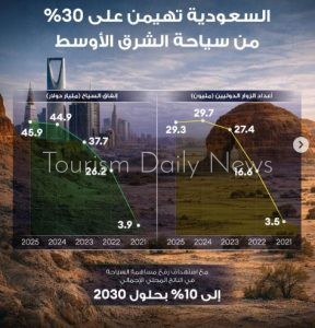 أضاف : إنه ومع استهداف رفع مساهمة السياحة في الناتج المحلي الإجمالي إلى 10% بحلول 2030، تواصل السعودية ترسيخ موقعها كقوة سياحية إقليمية، مدفوعة بزيادة لافتة في أعداد الزوار الدوليين خلال السنوات الخمس الماضية.. هذه نظرة سريعة بالأرقام على مسار هذا التحول.