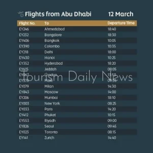 أما الخميس 12 مارس (آذار) فيشهد تشغيل 20 رحلة، تعود فيها وجهات أحمد آباد، وبانكوك، وكولومبو، وهانوي، وسيول، وزيورخ، مع انطلاق رحلة جدة EY615 في الثامنة صباحاً بوصفها أولى رحلات اليوم.